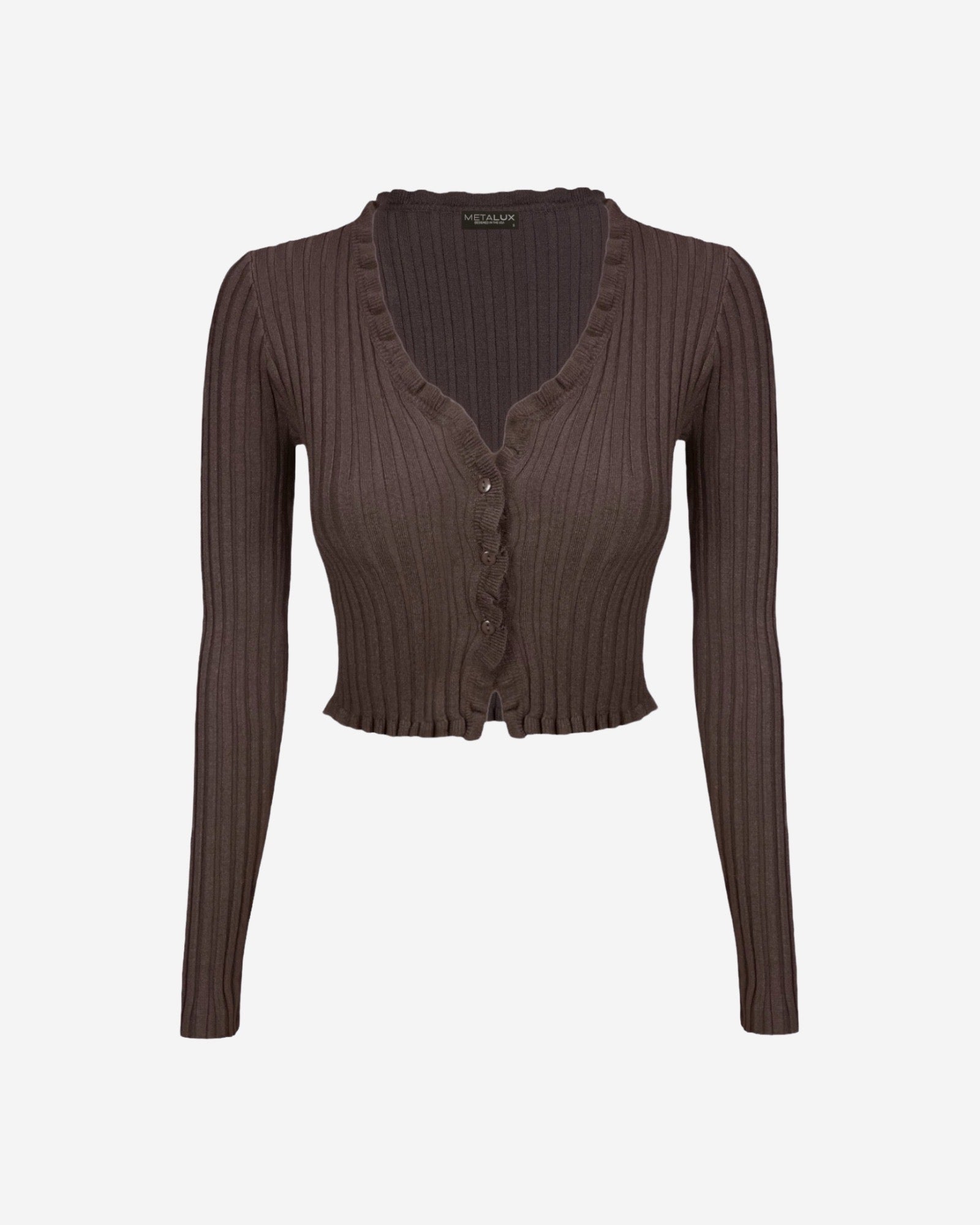 The Wolfe Bodycon Knit Top is perfect for day-to-night wear. It features a button down front, ultra stretchy fabric and decorative ruffled seams. The thick ribs provide a flattering silhouette and a spare button is included for convenience. This top is sure to become an essential in your wardrobe.
