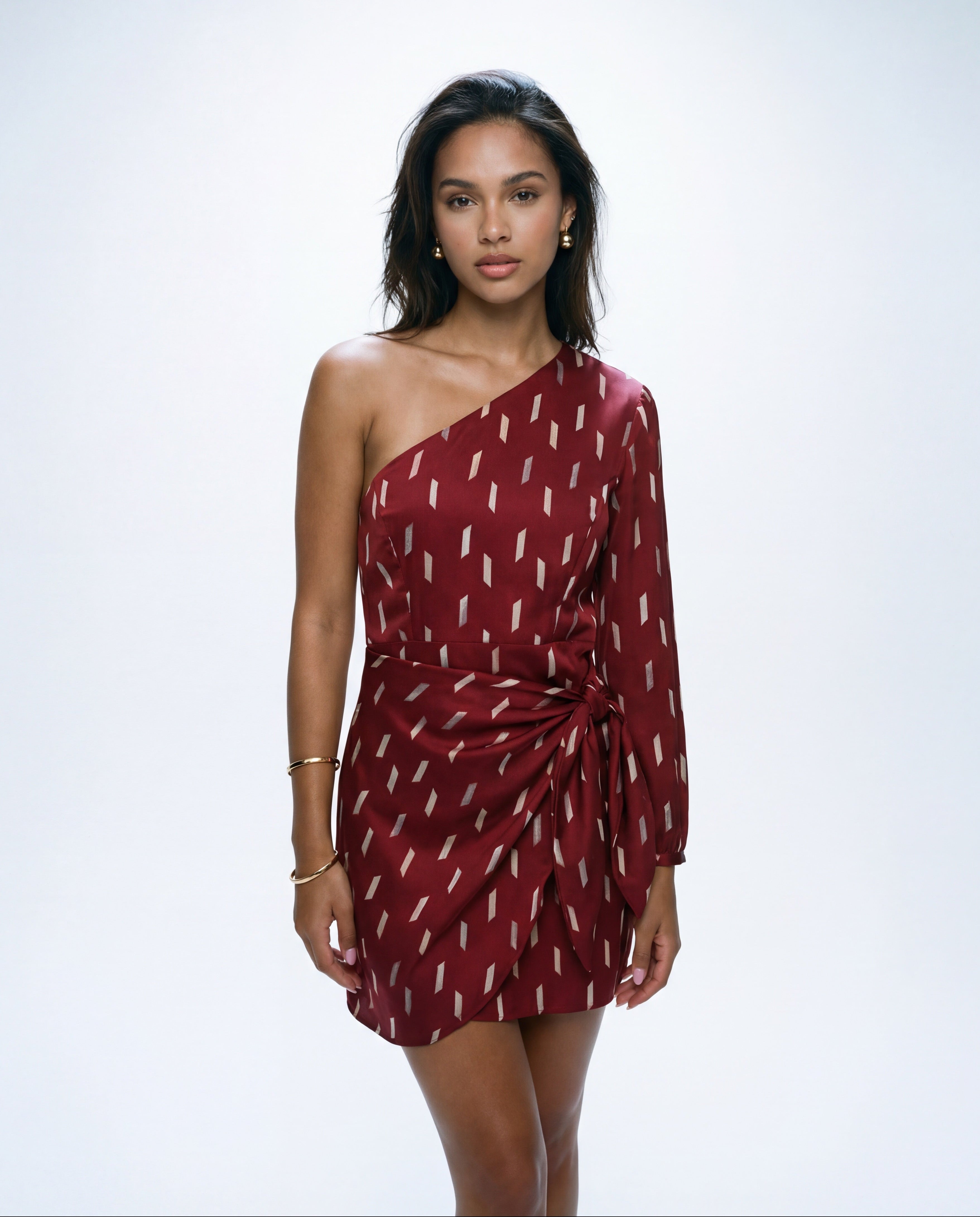 Unleash your wild side with the Stanton Single Shoulder Dress. Its geometric print adds a touch of edginess while the one shoulder design and tie waist provide a flattering and playful look. Perfect for any occasion, this dress will have you turning heads and feeling confident.